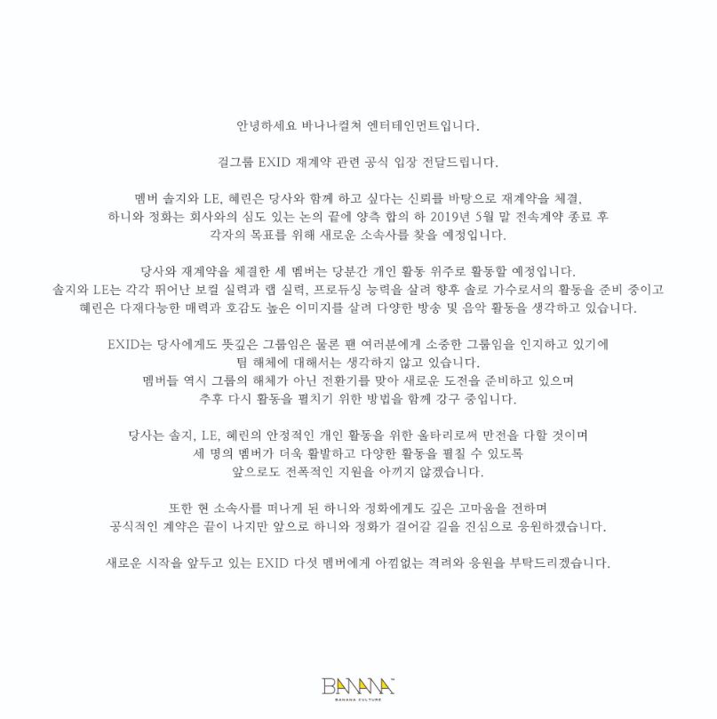 EXID不僅是對本公司是意義深遠的組合,而且對各位粉絲來說也是珍貴的組合,因此不考慮解散組合. 成員們不是解散組合,而是在轉換期準備新的挑戰,為了以後再次展開活動,正在一起研究方法.