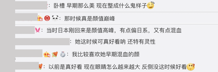 過去Angelababy不斷被外界質疑整形,近日有許多微博博主翻出她早期的照片,在照片中Angelababy穿著一件黑色流蘇短版背心,下身只穿著一件藍色三角褲,而她倚靠著旁邊的機車擺出各種POSE,當時的Angelababy頭髮是金色的,也因為混血的關係五官相當立體,顏值相當的高,而網友們也紛紛留言:「以前是真好看 現在眼睛怎麼越來越大 反倒沒這時候好看」、「我比較喜歡她早期混血的顏」、「她這時候可真好看吶 還特有靈性」、「當時日本剛回來是顏值高峰,有點偏日系,又有點混血」