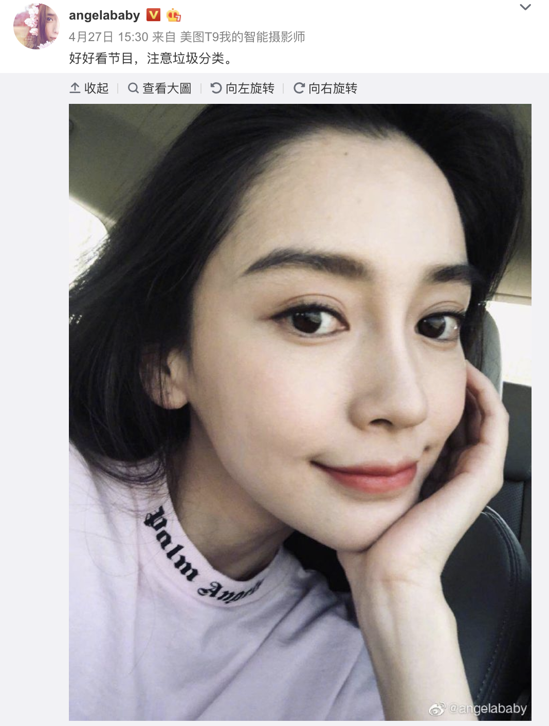 近期《奔跑吧》也播出最新一季,然而在上週五首播時,許多網友紛紛質疑Angelababy是不是又動刀了,發現她的眼睛似乎又比以前更大了一些,臉部整體的比例有些不協調,然而Angelababy在4月27日時,在微博上發布了一張自拍照並特寫臉部,寫下:「好好看節目,注意垃圾分類」,這句話以及這張自拍照也被網友們解讀為是在回應《奔跑吧》節目中大家對於她整型的質疑。