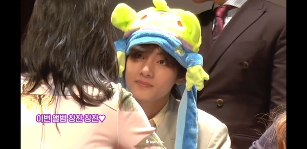 25日,防彈少年團現身於首爾新村舉辦的新專輯簽售會,展現親民的一面,從戴髮箍、頭套到裝可愛等等的互動,增進與粉絲之間的距離。其中,一位女粉絲讓成員V戴上了三眼怪的頭套後,開始稱讚新專輯的優點,在看似平常的對話後,女粉絲突然接著說「泰亨啊,你全部都做得很棒,但如果能修正補強一個東西的話就更好了」,此話一出讓V有些緊張,並恭敬的反問女粉絲「是甚麼呢?請告訴我」,不料,女粉絲竟然回答「我的心臟」。