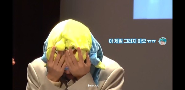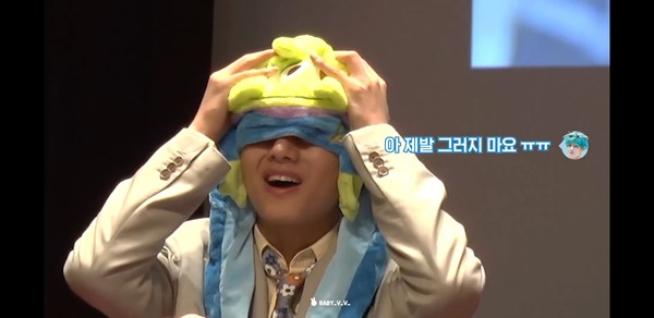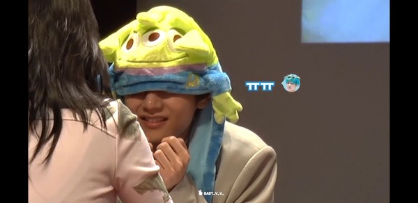 此話一出,讓V頓時害羞的將三眼怪的頭套往下拉蓋住自己一半的臉,粉絲肉麻的答案令他不知所措十指成線捲曲狀態,並小聲地說到「啊~拜託不要這樣....」,害羞的舉動讓現場突然躁動起來,粉絲相機的快門聲更是暴增,為了捕捉這段精彩的畫面。而整段對話的影片更是被網友上傳到網路,引起許多粉絲的討論,紛紛表示「泰亨的聲音跟笑容真的超甜」「好羨慕韓國的粉絲哦」「泰亨好可愛!」