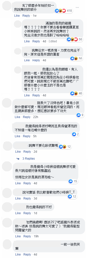 只見網友紛紛留言:「跳了那麼多年始終如一,我說舞技的部分」、「就長大了沒特色吧!畢竟小孩做什麼都可愛,現在眼神看起來蠻空洞的,而且網美那麼多,想紅應該要多下功夫」、「完全沒進步我也是醉了哈哈哈哈」、「跳舞從來一號表情,力度也完全不夠,原來這是所謂的厲害」、「我是覺得小時候這樣跳舞很可愛,長大跳這樣好像有點尷尬」,不過同時也有網友認為兩人明明跳得還不錯,希望其他網友不要太過嚴苛。