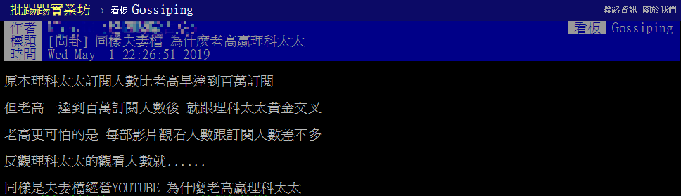 事實上過去就曾有網友發文比較啾啾鞋以及理科太太的發展,怎料近日,又有網友在PTT發文《同樣是夫妻檔,為什麼老高贏理科太太》,比較「理科太太」及「老高」的發展!這次原PO表示理科太太比老高還要早突破百萬訂閱,不過在老高百萬訂閱之後,卻迅速來到了124萬,反觀理科太太則成長漸緩,目前停在106萬訂閱。同時網友也發現,老高最近的影片幾乎每部都突破百萬觀看,理科太太卻明顯低了許多。