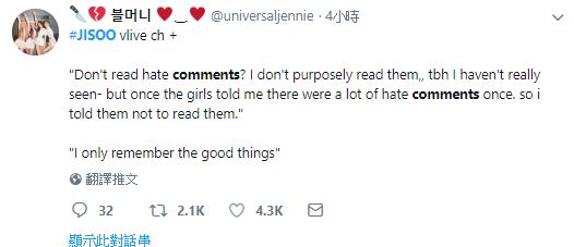 然而Jisoo的回應言下之意似乎暗指其他成員曾經備受留言影響,引起網友心疼表示「不知道Jennie的心情怎麼樣」、「感謝Jisoo這麼正向」。