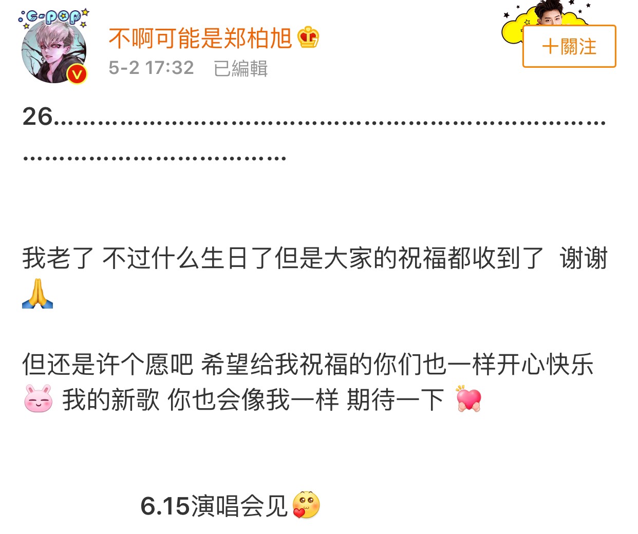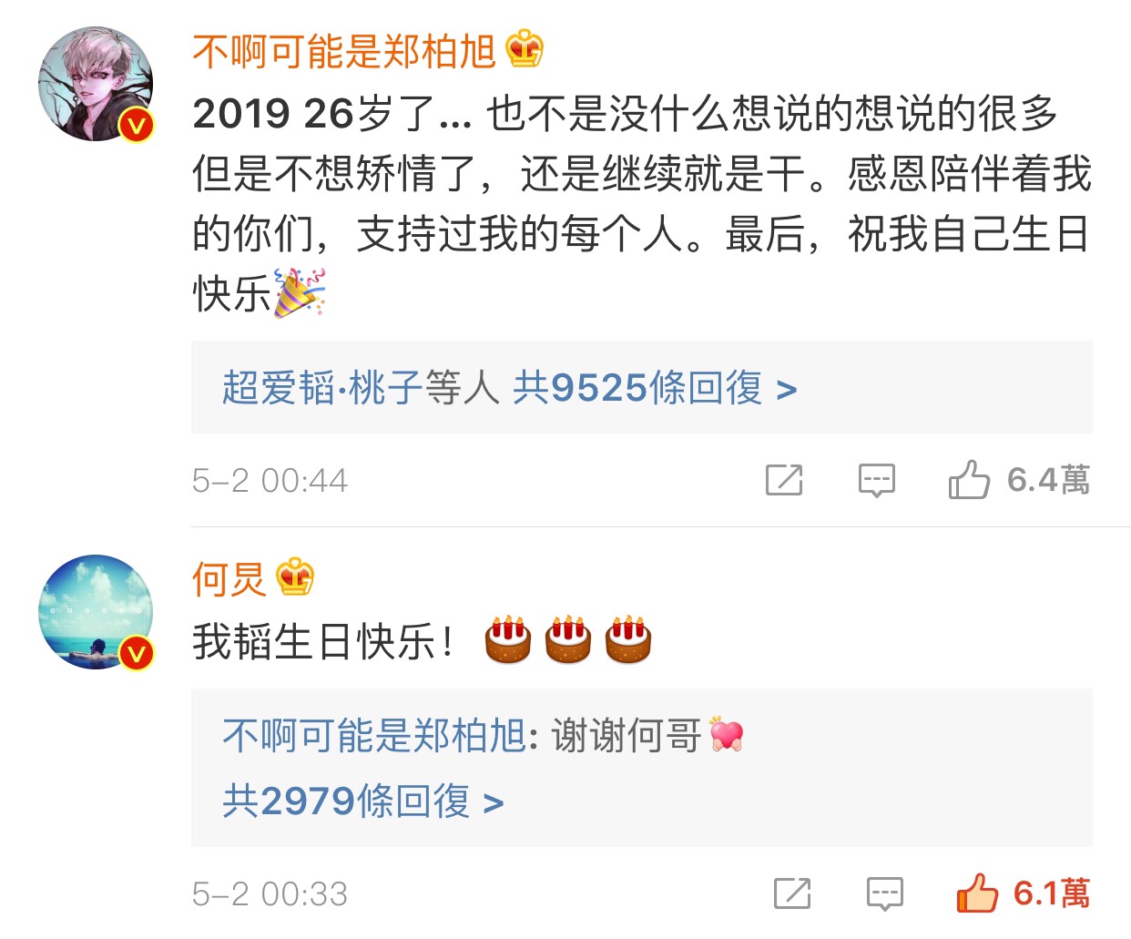 黃子韜於5月2日慶祝26歲生日的到來,並在微博上寫下:「也不是什麼想說的,想說的很多 但是不想矯情了,還是繼續就是幹。感恩陪伴著我的你們,支持過我的每個人。最後,祝我自己生日快樂!」這則在生日當天累積了22.3萬個讚,許多藝人也都在第一時間送上祝福,包括何炅、任濤、Yamy、傅菁等人,都希望他能有個開心的生日。