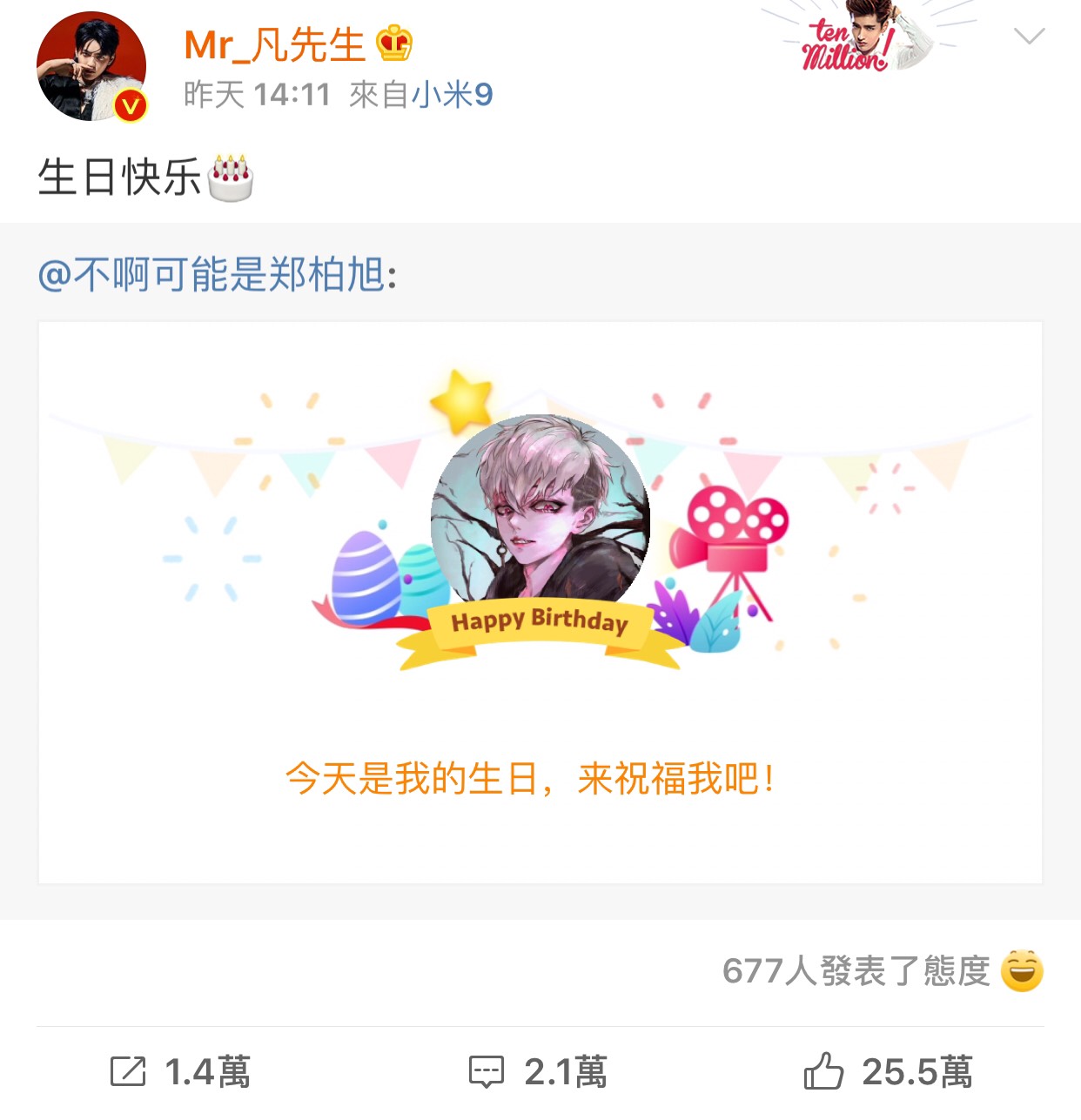 大陸藝人黃子韜26歲生日了!曾為韓國男子團員EXO及中國分隊EXO-M成員,現自行成立個人娛樂公司。時間一過12點,藝人紛紛送上祝福,可以知道他在演藝圈有相當的好人緣,同時粉絲也紛紛留言,微博瞬間熱鬧了起來。眾多祝福當中,最受矚目的莫過於吳亦凡,在自己微博上轉發了並寫下「生日快樂」,雖然只寫下短短1句話,卻是自從2014年退出EXO之後,第一次主動留言給黃子韜,讓粉絲欣喜若狂!