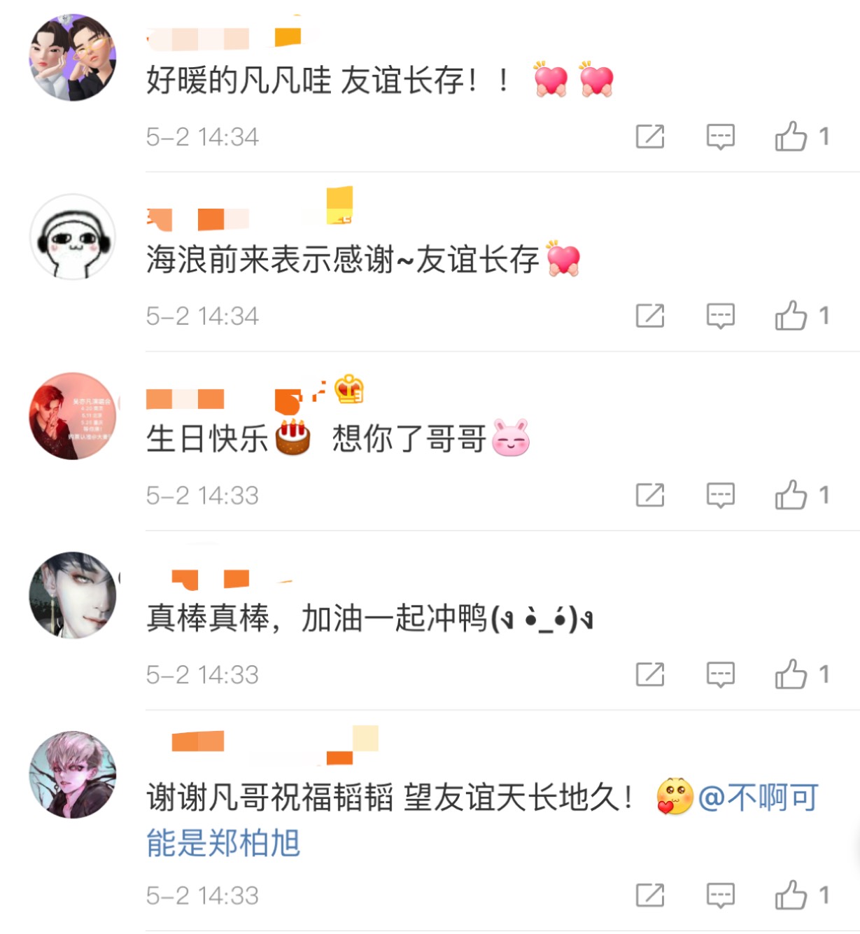 現在吳亦凡公開轉發黃子韜的微薄,寫下1句「生日快樂」,附上小蛋糕貼圖,為昔日的戰友送上祝福。眼尖的網友發現當天吳亦凡一整天只上線1分鐘,應該就只為了給黃子韜送上祝福,在百忙當中登入微博,只為了給予祝福,可見他對朋友生日的重視,這則更是高達了25.6個讚。令許多粉絲激動,直呼:「友誼萬歲」、「好暖的凡凡」。