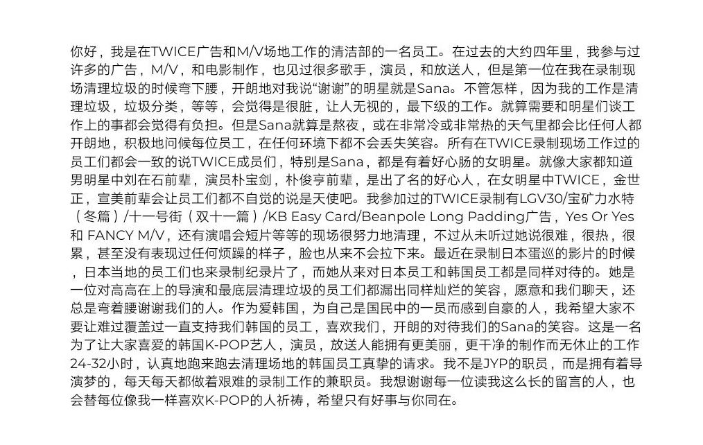 文末除澄清自己真的不是JYP內部員工,也再度呼籲外界同樣身為愛國的韓國人,他認為「大家不要讓難過(指該事件),覆蓋過一直支持我們韓國員工,喜歡我們且開朗對待我們的Sana的笑容」。