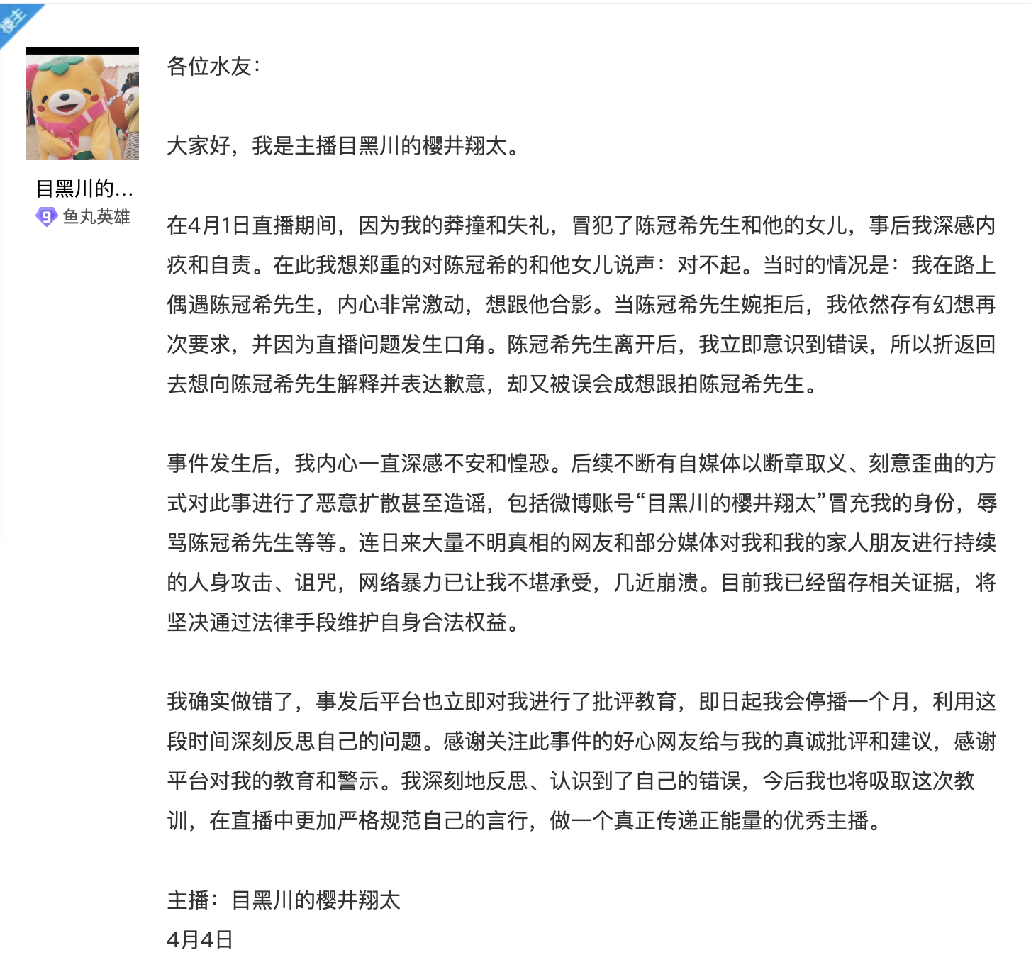 然而在4月4號時,該名直播主在鬥魚平台寫下一篇道歉的文章,除了還原當時的場景與當下的心情之外,也提到了事發之後他的內心一直感到非常不安與慌恐,且甚至被許多媒體、網友惡意的造謠散佈不實消息,而大家持續不斷的謾罵與攻擊造成他的心靈幾乎要崩潰,接著更寫下:「我確實做錯了,事發後平台也立即對我進行了批評教育,即日起我會停播一個月,利用這段時間深刻反思自己的問題。」,自宣佈後至今日(5/4)剛好滿一個月。