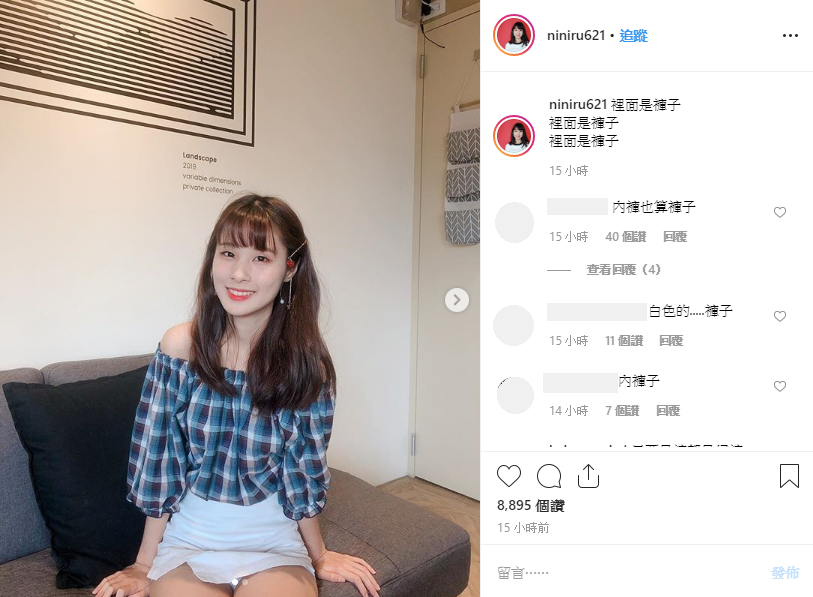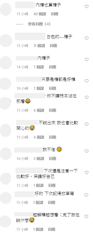 只見粉絲紛紛留言:「內褲也算褲子」、「白色的.....褲子」、「內褲子」、「只要是褲都是好褲」、「白色的!!!」、「我不信」、「下次還是注意一下比較好。保護好自己」、「好的 下次記得放草莓」,也有網友搞笑回覆:「妳不講根本沒往那看」、「越解釋越想看」。