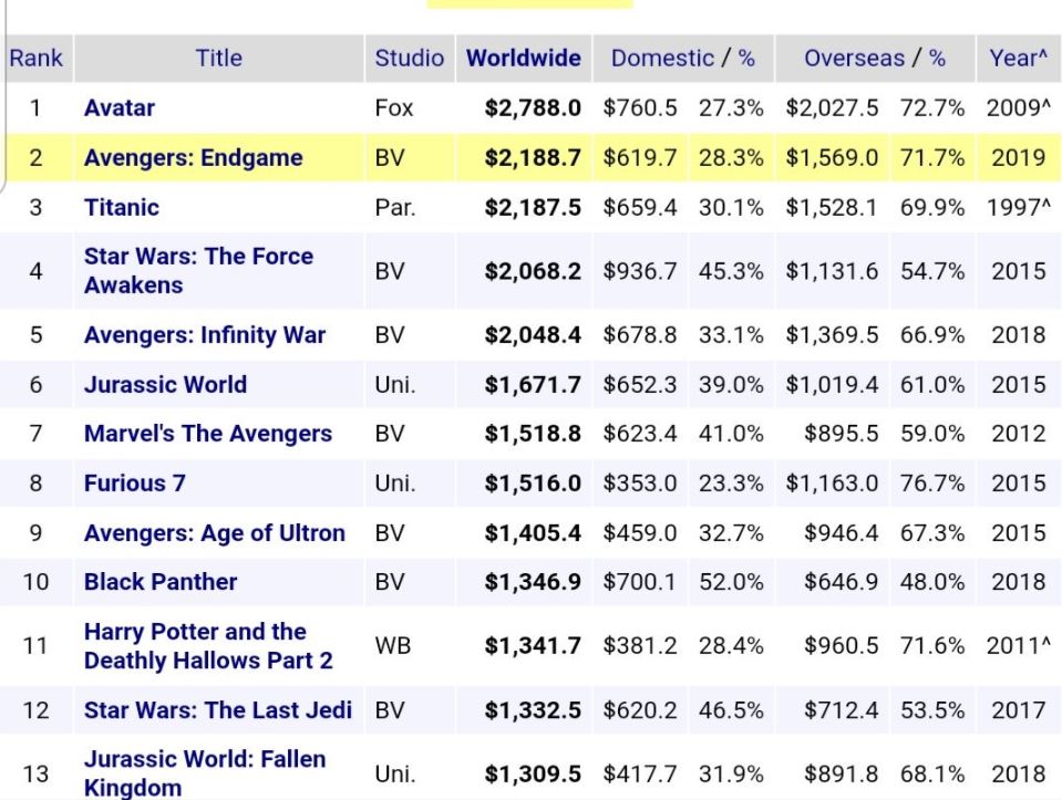 漫威英雄電影《復仇者聯盟:終局之戰》(Avengers: Endgame)上映至近即將滿2周,作為宇宙系列電影11年來的最終章,「終局之戰」就在全世界掀起熱潮,上映後票房也開出紅盤,根據《法新社》報導,《復仇者聯盟:終局之戰》全球票房至今已達21億9千萬美元(約新台幣675億元),已經成為影史上票房亞軍,超越《鐵達尼號》(Titanic)。