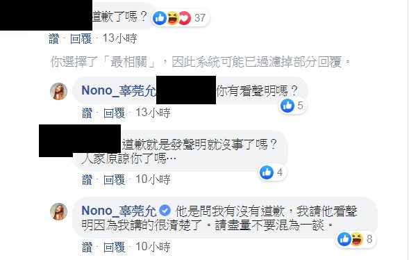 還有網友問她:「道歉了嗎?」辜莞允則說:「你有看聲明嗎?」另一名網友也不滿說:「道歉就是發聲明就沒事了嗎?人家原諒你了嗎…」辜莞允也解釋:「她是問我沒有道歉,我請她看聲明因為我講得很清楚了,請盡量不要混為一談。」