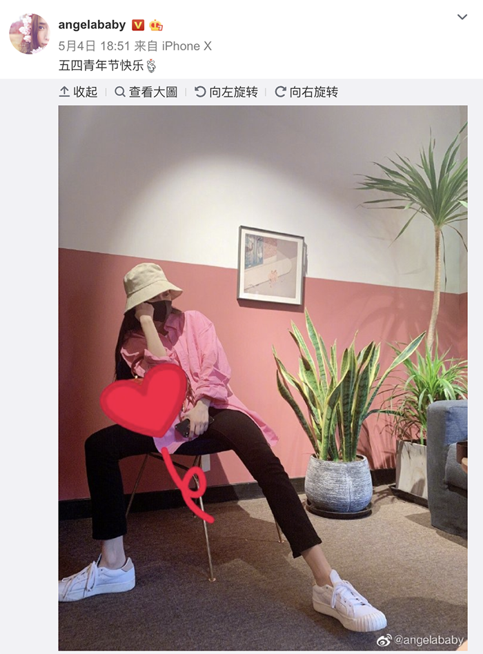 Angelababy在5月4號當天晚上時發出一張照片,並寫下:「五四青年節快樂」,在照片中Angelababy身穿一件粉紅色的襯衫,並戴著一頂帽子以及口罩,下半身則是穿著緊身的黑長褲,而她坐在椅子上,雙腿非常得開,也展現出她纖細的大長腿,網友看見照片後也相當激動的留言:「我等到大長腿營業了?」、「寶貝腿好長」、「啊啊啊這大長腿」、「姐姐腿好長」,但也有網友質疑她的腿有些不自然,是不是有修過圖。