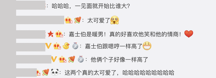 這次嗯哼來香港找Jasper也展現出兩人友好的交情,兩人走在路上時,Jasper不斷伸手去抱著嗯哼,而嗯哼之後也將Jasper抱起來,感情相當的好。網友看見這兩段影片後,也紛紛留言:「這兩個真的太可愛了」、「他倆個子好像一樣高了」、「Jasper跟嗯哼一樣高了」、「真的好喜歡他笑和他的情商!」、「哈哈哈,一見面就開始比誰大?」、「歷史性的同框啊!」