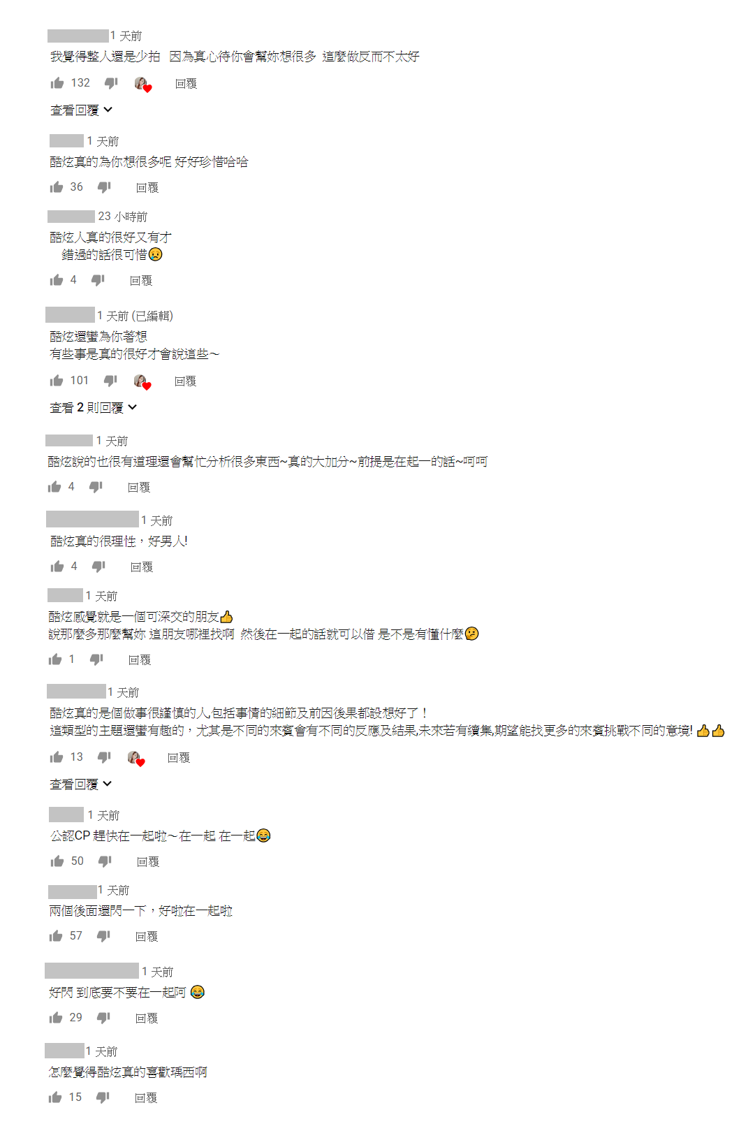 影片中「酷炫」穩重的暖男姿態,受到了許多網友的讚許,紛紛留言表示「酷炫真的為你想很多呢 好好珍惜哈哈」「酷炫人真的很好又有才」「酷炫真的很理性,好男人!」此外更有不少網友大站CP,催促兩人趕快「在一起」,迸發出許多粉紅泡泡。