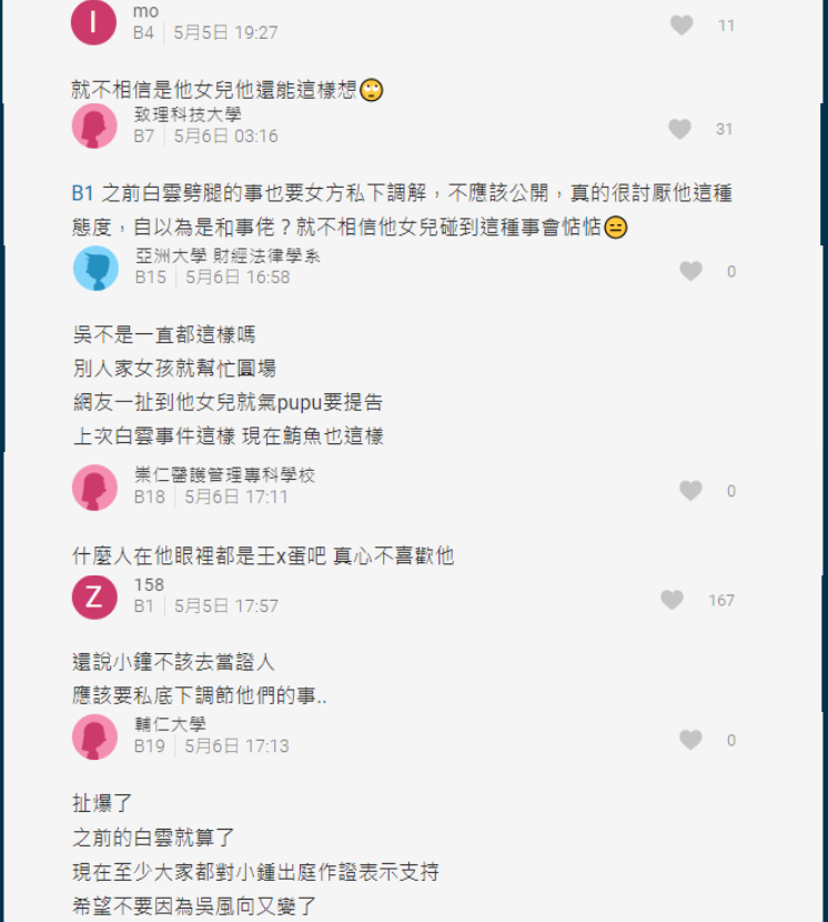 不過憲哥的說法卻引來網友不滿,不少網友在Dcard上留言:「就不相信是他女兒他還能這樣想」、「我都傻眼了,自己也是有女兒的人阿,腦有事欸」、「 之前白雲劈腿的事也要女方私下調解,不應該公開,真的很討厭他這種態度,自以為是和事佬?就不相信他女兒碰到這種事會惦惦」、「如果是Sandy被偷拍也忍一忍私下和解就好了唷~」