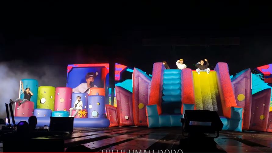 而BTS在演唱較輕鬆的歌曲《Anpanman》,更將大型充氣溜滑梯搬上舞台,他們將一般會出現在兒童活動場上的大型充氣溜滑梯,搬上了演唱會舞台,成員們彷彿回到了孩童時期,一邊唱著熱門曲,一邊還溜著滑梯或是坐著充氣椅墊上彈跳的模樣,再度讓粉絲的少女心融化。