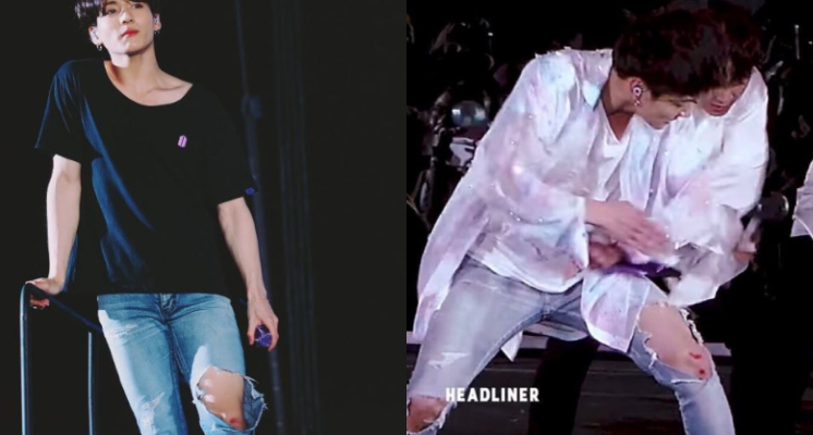 然而當天柾國演出時,意外被現場觀眾捕捉到膝蓋濺血的畫面。柾國坐在舞台邊緣時,牛仔褲挖洞處露出的膝蓋就已經瘀青,接下來柾國站著的畫面中,雙腳膝蓋都已經在滲血,讓粉絲相當心疼表示「柾國打破了說好不在阿米(粉絲名)面前受傷的承諾」。