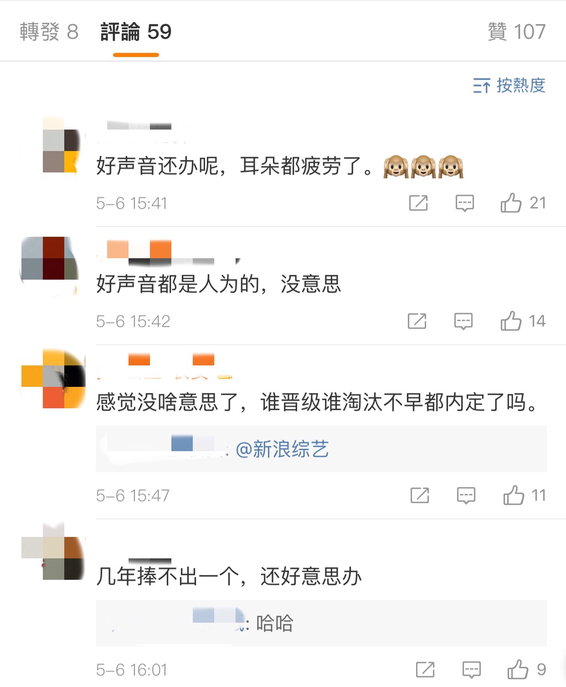 《中國好聲音》自2012年播出後創下高收視率,不知不覺已播至第8季,6日發布定檔海報,確定播出時間後,卻引來不少網友反彈聲浪,網友紛紛留言,「好聲音還辦呢,耳朵都疲勞了」、「好聲音都是人為的,沒意思」、「幾年捧不出一個,還好意思辦」。許多網友對於上一季表示不公平,認為賽程和冠軍都是事先內定,讓許多觀眾由粉轉黑。