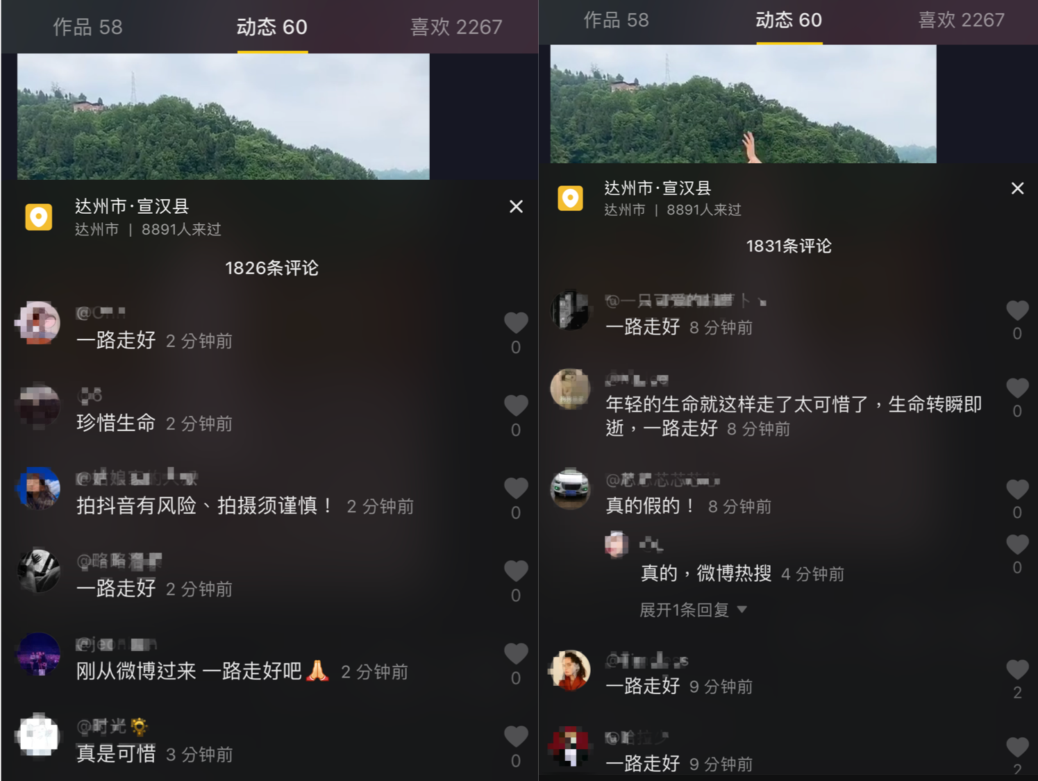 近日,有一位舞蹈老師在四川的漫水橋旁拍攝赤腳跳舞的影片,但是在拍攝完影片後,她要走下到河畔旁洗腳,在這過程中卻不慎失足落水,不幸溺斃,此消息很快的就傳遍了整個大陸,許多網友紛紛到該位老師的頻道下方留言哀悼,寫下:「一路好走」、「珍惜生命」、「年輕的生命就這樣走了太可惜了,生命轉瞬即逝,一路好走」,然而身前導致她失足的那段影片也被刪除了。