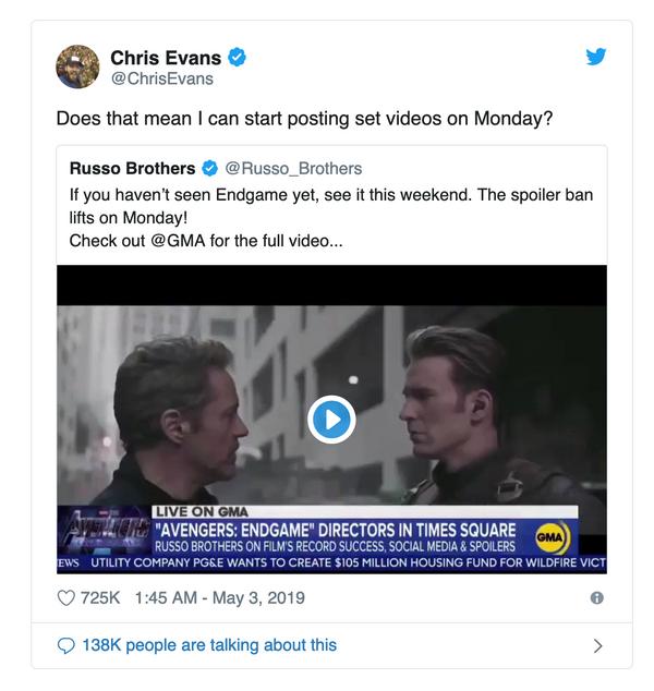 ▼先前聽聞導演羅素兄弟(Russo Brothers)宣布「防雷禁令」將在 5 月 6 日解禁,「美國隊長」克里斯伊凡(Chris Evans)早就摩拳擦掌,還特地在推特上回覆:「所以,這表示禮拜一開始我就能放上我們的幕後影片了嗎?」