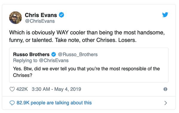 另外前幾天克里斯伊凡(Chris Evans)也特別在推特貼出,漫威三位克里斯要選哪一位的有趣貼文。羅素兄弟(Russo Brothers)特別回覆:「我們有跟你說過,你是所有『克里斯』當中最可靠的那位嗎?」,克里斯伊凡也說:「顯而易見的,還是最酷、最帥、最幽默、最有才華的那位,其他的克里斯、都是魯蛇」。