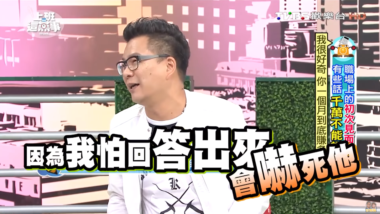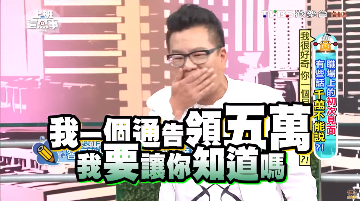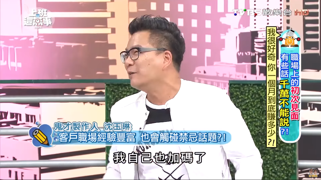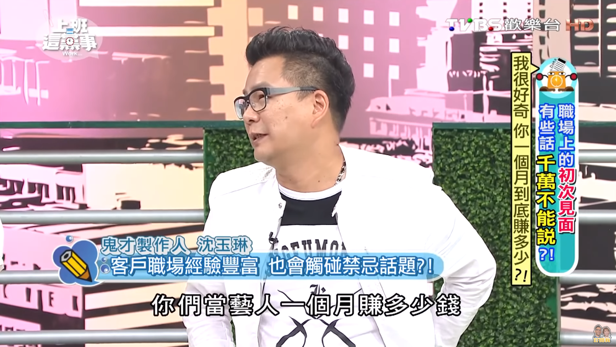 沈玉琳透露,他曾碰過一個客戶想找他代言產品,沒想到對方坐下來就問他「你們當藝人一個月賺多少錢?」沈玉琳不想回答尷尬說:「還好啦~」對方鍥而不捨繼續追問:「那你們一天下來可以賺多少錢?」但沈玉琳還是不願意回答,只說通告費這種是因人而異,直到對方講了一句話才讓他徹底抓狂:「你不講我也知道,我看報紙就說你們一個通告就是1350」,讓沈玉琳激動大喊:「放屁!誰在1350啊!我一個通告領5萬也要讓你知道嘛!」不過沈玉琳強調,自己是因為太生氣了才會再往上加一點,黑人也說:「你可能一天就賺得比他一個月多」沈玉琳也回答「不好說!不好說!」