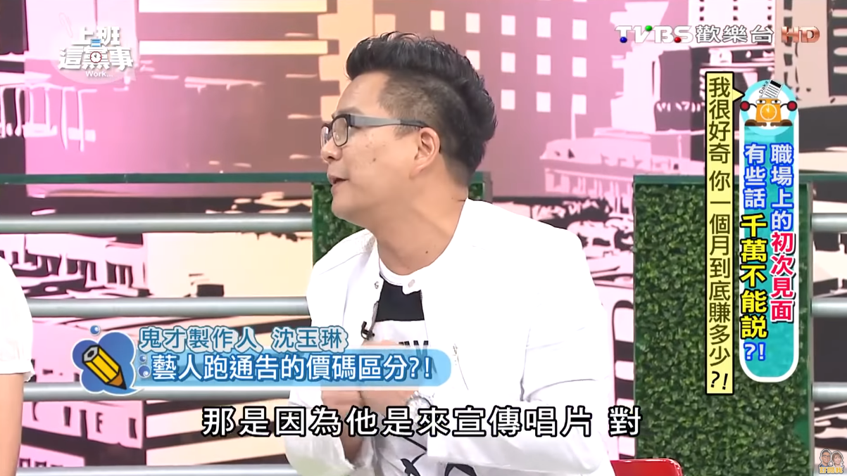 不過沈玉琳也藉此向觀眾解釋,為什麼蔡依林、羅志祥這種大咖歌手上節目也只領1350,那是因為他們是上節目宣傳唱片的,「用現代的術語來講就是置入」,以宣傳的角度來說應該是要付製作單位宣傳費,但不用付錢打廣告,製作單位還會付1350元當作車馬費給藝人,到現在一直都沒有漲價,且團體中有5個人就是5個人去平分。