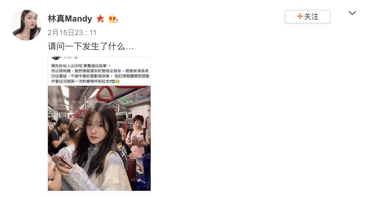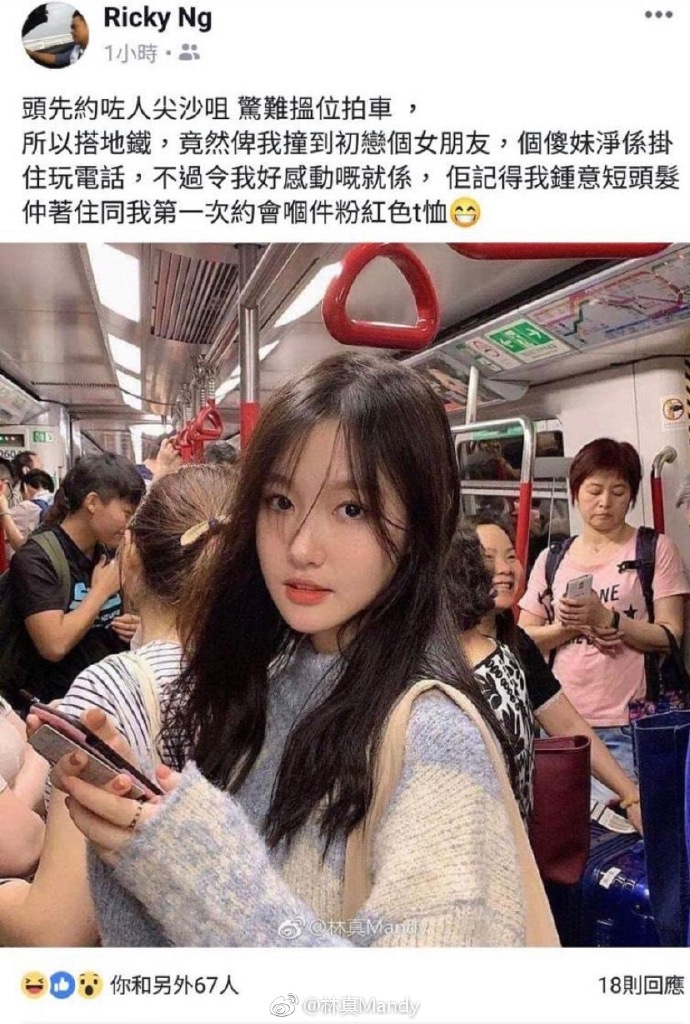 網路興起的時代下,許多人可能因為一則影片甚至是一張照片就能夠爆紅,而現今也有許多人因為擁有亮麗的外表,以及姣好的身材而被網友們發現進而追蹤,晉升為網美。日前有一名香港網友發文宣稱在搭地鐵時巧遇「初戀女友」,當時有一名女生倚靠著車廂的門邊,正好在滑手機,且該名女生的髮型與穿的衣服都和他初戀女友第一次約會時一樣,而照片發出後大家紛紛歪樓,關注起鏡頭正前方那位正妹。