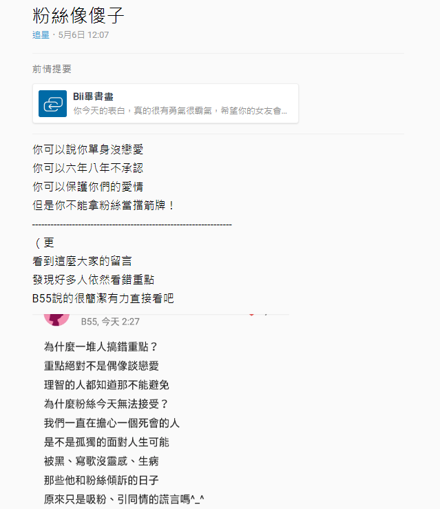 一名粉絲在Dcard上PO文,直說這些年來粉絲都像個傻子,「你可以說你單身沒戀愛,你可以6年8年不承認,你可以保護你們的愛情,但是你不能拿粉絲當擋箭牌!」有網友認為,粉絲們最不能接受的點是,當時他在經歷憂鬱症低潮期的階段,許多人擔心他一個人面對被抹黑、沒靈感、痛苦的生活,但事實上那時候早就有人陪伴在他身邊,「那些他和粉絲傾訴的日子,原來只是吸粉、因同情的謊言嗎?」