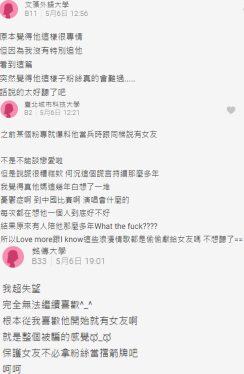 不少Dcard網友也直說:「不是不能談戀愛啦,但是說謊很糟糕欸,何況這個謊言持續那麼多年」、「他就算有女友不公開也能理解,但是講那些好聽話說真的沒人逼他吧!還許願什麼希望在聖誕節交到女友,他不尷尬我都替他尷尬了,真敢講」、「我覺得他可以為了保護戀情而說自己單身,但為了粉絲不敢談戀愛這種話就多了」。不過也有粉絲認為:「有沒有自己坦誠交往真的那麼重要?每個人都有幾件事想隱藏著,畢如此認真地對待音樂我看到了,粉絲會不清楚?」、「戀愛這種是,我們既不用跟誰交代,那他也不用跟我們交代啊」。