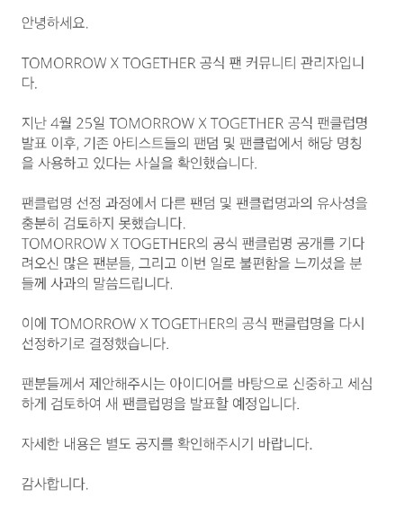 對此,經紀公司BigHit過了11天,才終於發布官方聲明,表示會更換並對外徵求粉絲名稱。聲明中,首先表示「粉絲名稱已有藝人的粉絲團和粉絲俱樂部使用該名稱」,接著也向外界反省「沒有充分考慮與其他粉絲團體及粉絲俱樂部名稱的相似性」,文末則對粉絲和「對此事件感到不便的人」表達歉意。