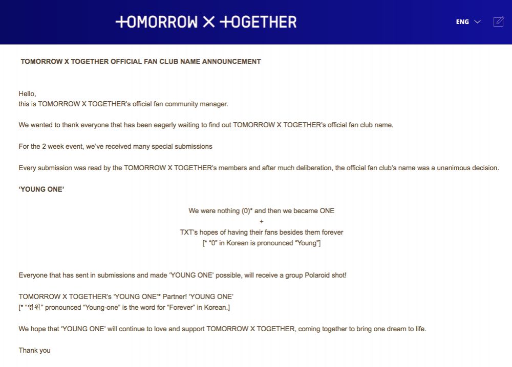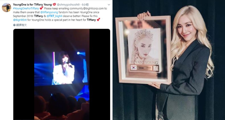 上月25日,男團TXT光速以新作品《Cat&Dog》回歸,同時也公布官方粉絲名為「Young One」,沒想到相同名稱少女時代成員Tiffany,去年9月20日,就在粉絲見面會上宣布使用,事情一出引起軒然大波,公司挨轟「希望弟弟們的工作團隊可以爭氣一點」、「完全冒犯了禁忌啊」。