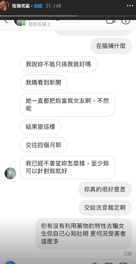 王姓女模今在自己的IG帳號「betty_yumo」中連PO數十則限時動態,更將這些動態整理成精選「垃圾老鼠」,裡面除了她和教授鼠鼠的對話截圖,其他受害者的對話,更有別的網友提供的罪證,完全把整件事攤在陽光下。動態中就包含一段教授鼠鼠的酒醉影片,其中可以聽到教授鼠鼠友人的聲音,「我真的不知你跟鼠鼠怎麼了,但是鼠鼠真的很想你很愛你,他今天已經從早醉到現在,真的很難過」。
