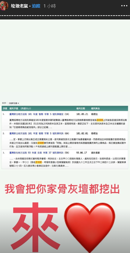 王姓小模還附上過去教授鼠鼠的前科,可以看見他在民國93、101年分別犯了過失傷害、商標法!她還語帶嘲諷打上「我會把你家骨灰罈都挖出來」,揚言將要所有教授鼠鼠的黑歷史都公開!