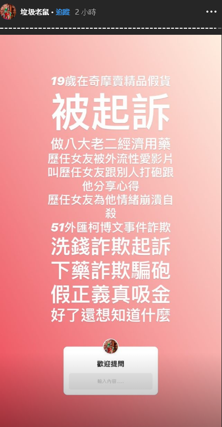而另一方面,王姓女模一一列舉教授鼠鼠的惡行,「19歲時賣假貨被起訴、做八大老二經濟用藥、歷任女友被外流姓X影片、叫歷任女友跟別人打炮分享心得、歷任女友位他情緒崩潰自殺、51外壞柯博文事件詐欺、洗錢詐欺起訴、下藥詐欺騙炮、假正義真吸金」,種種誇張行徑幾乎罄竹難書。