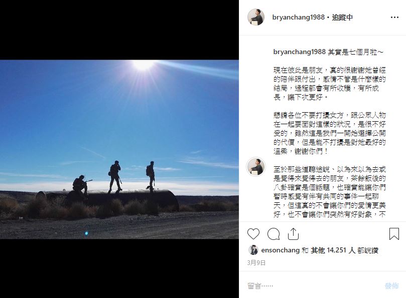 張書豪當時在IG證實,更正兩人是「分手7個月」,也就是去年8月左右,更在貼文中感性說,兩人現在是彼此的朋友,「真的很謝謝她曾經的陪伴跟付出」,也希望大家不要再去打擾女方,「跟公眾人物在一起要面對這樣的狀況,是很不好受的」。2017年張書豪大方認愛,更透露自己並不想為了工作遮掩,「我想要一個穩定的感情不想要玩玩」,只不過這也成了分手後的代價,「能不打擾是對她最好的溫柔」。
