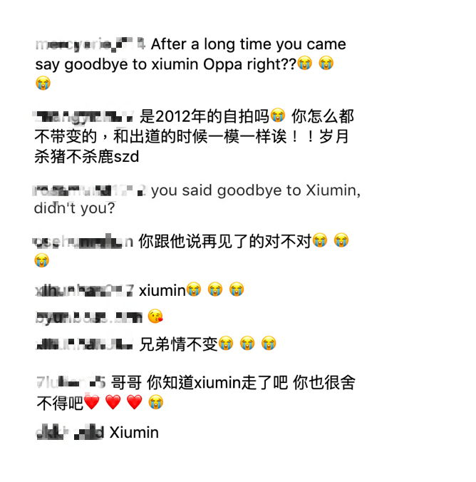 然而在昨日鹿晗也時隔兩個多月在IG上發文,且放上了許多張自拍照,寫下:「發點兒舊的自拍吧 哈哈」,許多粉絲都相當激動鹿晗終於想起要發自拍照了,也有人聯想到是否是因為XIUMIN入伍了,鹿晗是在向XIUMIN道別,紛紛留言表示:「是2012年的自拍嗎」、「After a long time you came say goodbye to xiumin Oppa right?」、「你跟他說再見了的對不對」、「哥哥 你知道xiumin走了吧 你也很捨不得吧」,大家紛紛聯想到兩人的兄弟情。