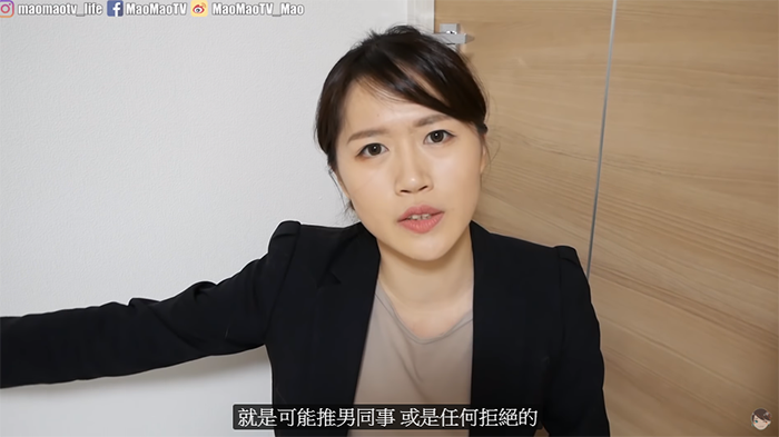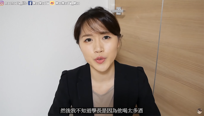 近日Mao上傳新片,提起自己過去還是社會新鮮人時,曾經遇到學長的性騷擾,不過她直到現在才決定把這件事說出來!Mao憶起當時自己剛剛進入公司不久,便和同期一起參加公司的研修,不過同行的也有另一位已經來五年的學長。公事結束後他們在酒店的餐廳吃飯,怎料那位學長疑似酒醉,竟然對Mao說道:「Mao醬的陰X還好嗎?」,讓Mao聽到直接嚇傻!