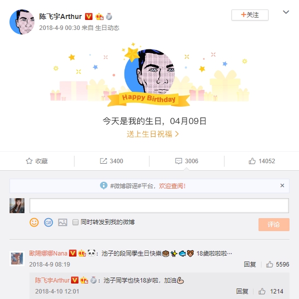 今年剛滿19歲的陳飛宇,是知名導演陳凱歌和演員陳紅的次子,雖然目前演出的作品不多,但他帥氣的外型早已擄獲一大票粉絲的芳心,代表作品為2017年的電影《秘果》,在劇中他飾演男主角,而女主角正是他近日被瘋傳的緋聞女友歐陽娜娜。