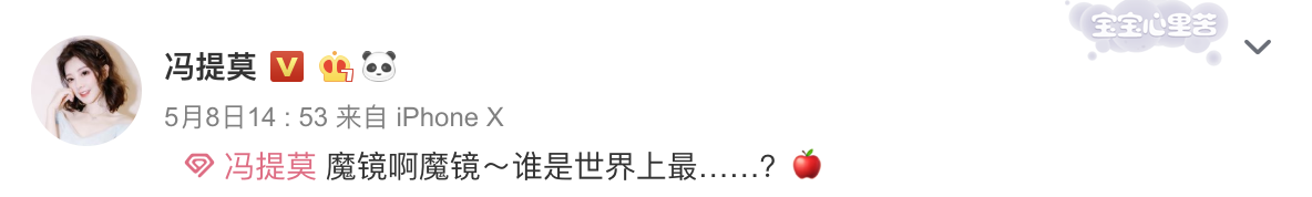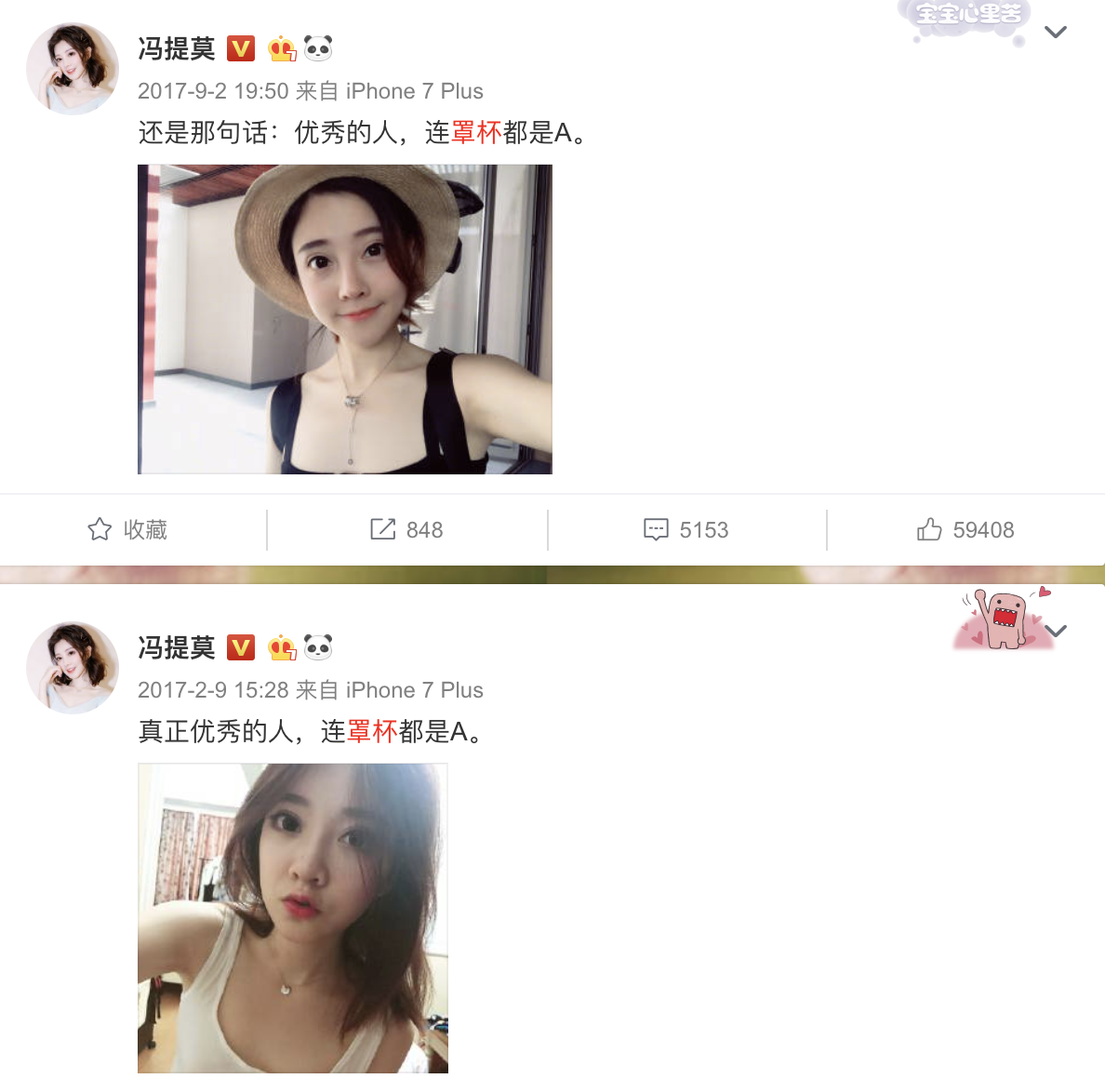 馮提莫昨日晚間在微博上發出4張照片,而這些照片中馮提莫都是在鏡子前拍攝,她也寫下:「魔镜啊魔镜~谁是世界上最……?」,馮提莫身穿一件草綠色的蕾絲洋裝,胸前微微露出一小條溝,她也將頭髮扎起,看起來相當俐落卻又不失甜美,而粉絲們也紛紛在留言區吐槽馮提莫:「誰是世界上最平的人?」、「誰是世界上胸最小的人」、「魔鏡啊,魔鏡,告訴我,誰是這個世界上最平的女人」、「誰是世界上有飛機場的女人」,甚至有網友吐槽她胸部的溝都是用畫的。