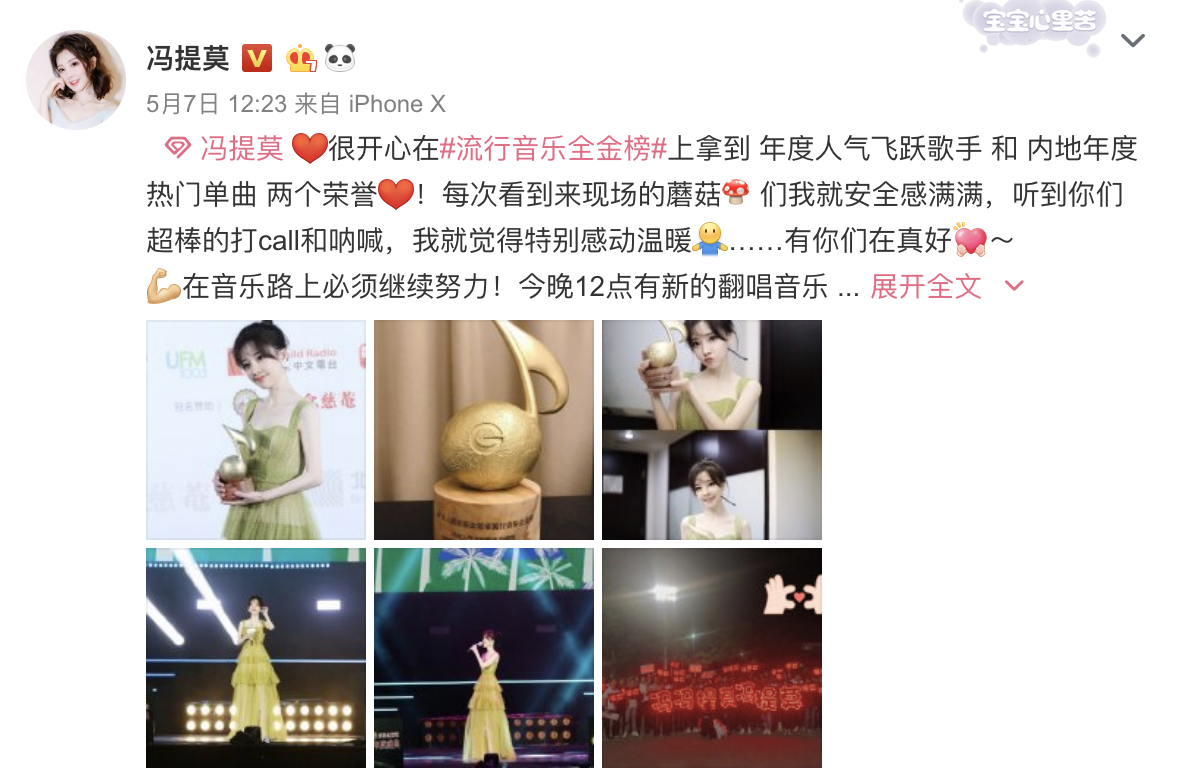 該套服裝是馮提莫受邀參加流行音樂全金榜時的造型,當天在頒獎典禮上她獲得了「年度人氣飛躍歌手」和「內地年度熱門單曲」兩大殊榮,事後她也在微博上發文感謝粉絲:「每次看到來現場的蘑菇們我就安全感滿滿,聽到你們超棒的打call和吶喊,我就覺得特別感動溫暖……有你們在真好」。然而在2017年時,馮提莫就曾發文自曝自己是「A罩杯」,也讓粉絲驚呼連連。