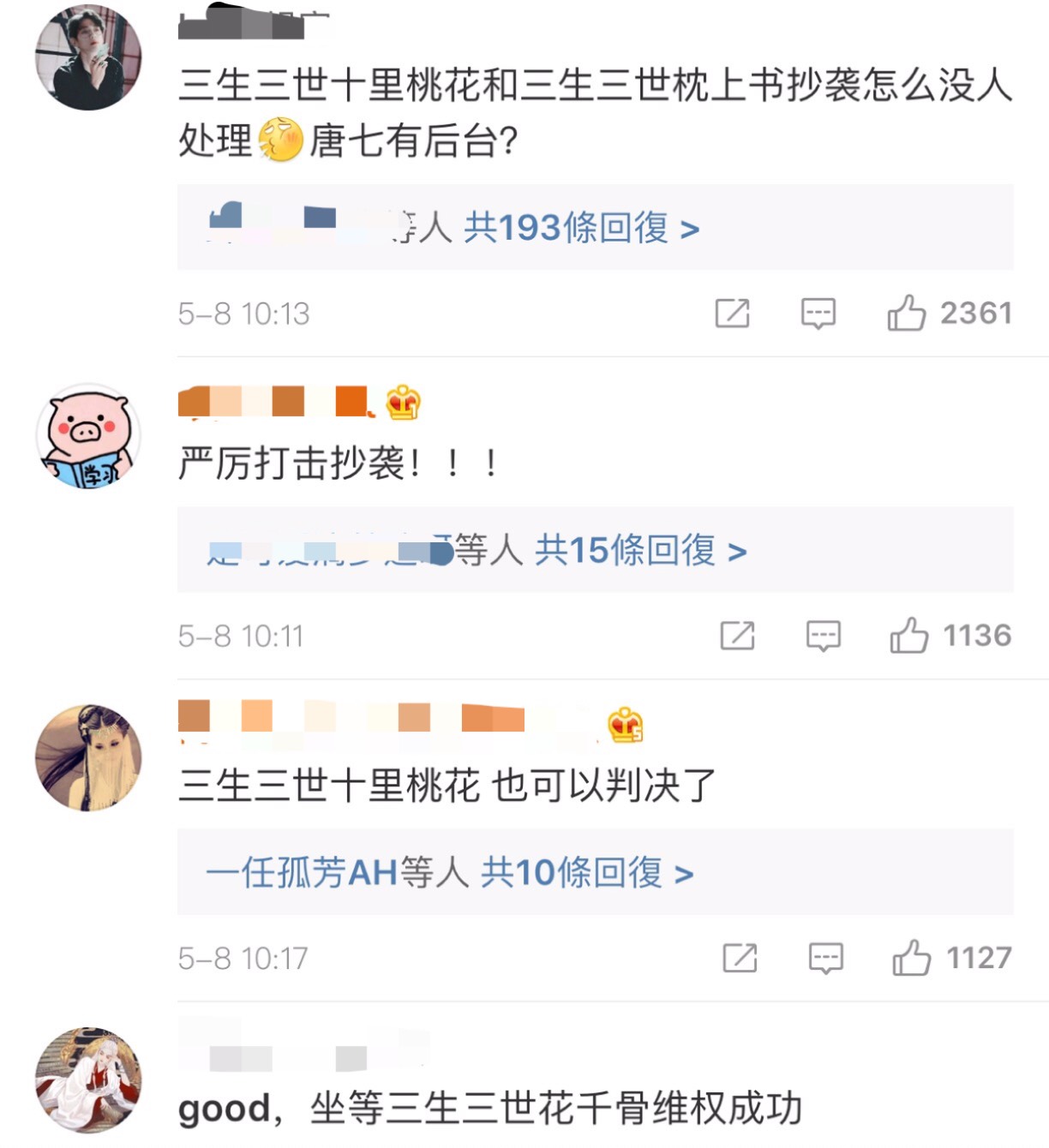 在大陸微博過去「言情小說抄襲舉報處」博主曾將作品做比對之後發現,竟與2019本書內容重疊,全書294個章節中,只有9章未抄襲,被抄襲的作品中甚至有瓊瑤的作品《梅花烙》,經過網友比對,發現一字都不改直接複製,這樣的行為讓大眾憤怒。而也有網友說道:三生三世十里桃花抄襲「桃花債」哪時候才會被判決?