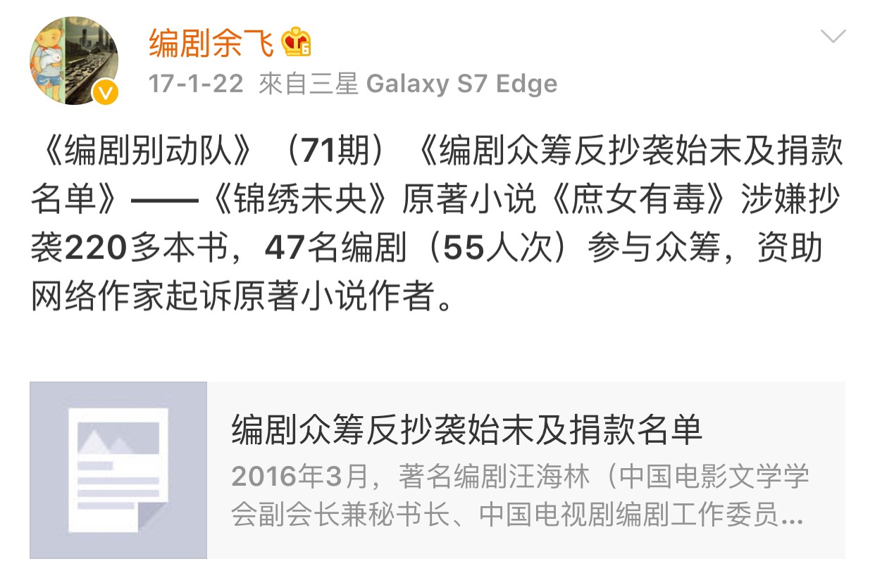 《錦繡未央》早在2013年就被指控抄襲,只是當時發表此部小說網站「瀟湘書院」,卻選擇處罰反對抄襲的作者,消息一出,引起軒然大波,不過電視劇還是持續開拍,在當時許多作家紛紛站出來維護權益、抵制,編劇余飛更宣佈資助被抄襲的網路作家對《錦繡未央》作者提告。