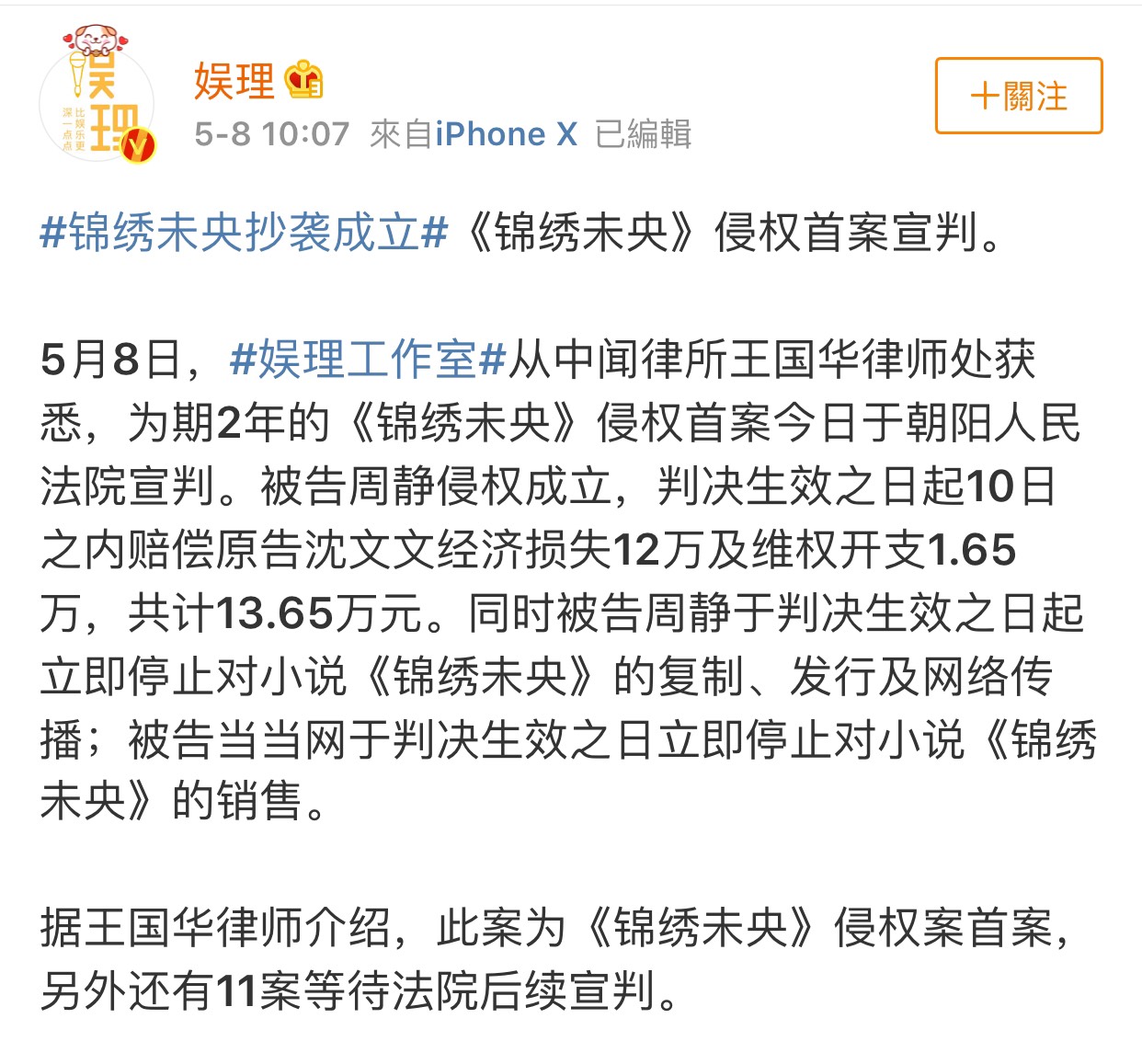 至今,《錦繡未央》於5月8日為期2年的侵權首案於北京朝陽人民法院宣判,被告周靜侵權成立,必須在判決生效之日起10日內,賠償原告沈文文經濟損失人民幣12萬元,以及維權開支1.65萬元,換算成新台幣後,共計63萬,判決下來之後許多網友大喊:判決金額太低,這樣的金額遠遠比不上抄襲的速度。法院也同時判決被告在判決生效日期裡立即停止對《錦繡未央》的複製、發行、銷售及網路傳播。另外《錦繡未央》的侵權首案,尚有11案等待法院判決。