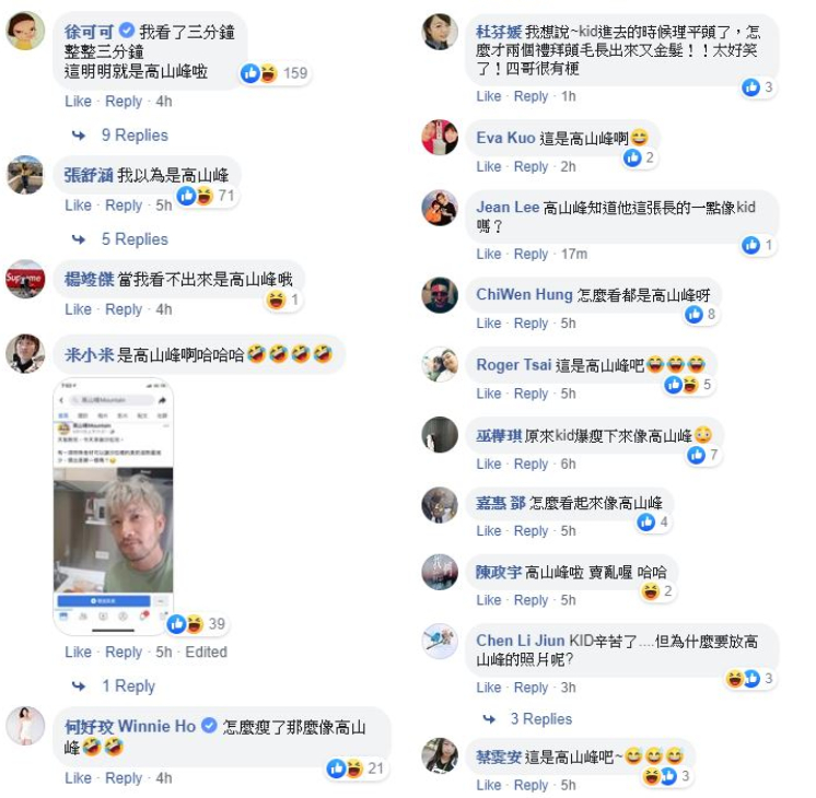 只不過網友們察覺有異,最後終於有人發現「這根本是高山峰啊!」甚至還翻出高山峰本人臉書也有這張照片,紛紛笑說:「我想說KID理平頭,怎麼才兩個禮拜就長長了」、「怎麼看都是高山峰啊」、「我還以為是我眼花」,甚至連徐小可都笑說:「我看了三分鐘,整整三分鐘,這明明就是高山峰啦!」