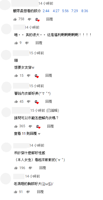 影片上傳之後,米砂性感的模樣也讓粉絲相當激動,紛紛留言:「觀眾最想看的部分 2:44 4:27 5:56 7:29 8:36」「蕾絲內衣都好美」、「嗯。真的很大。这是福利啊啊啊啊啊!」、「原來米砂只有Cㄛ 看那份量應該D以上」、「米砂穿什麼都好性感」,只能說米砂雖然之前生病,不過復出後仍然不負老濕姬的稱號!