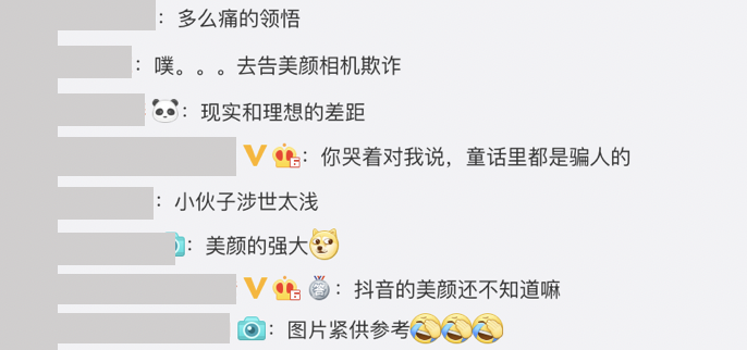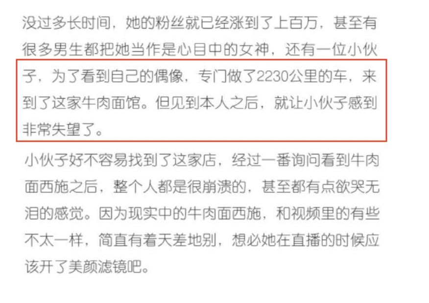 該名網友稱:「現實生活中的牛肉麵西施,和視頻裡有些不太一樣,簡直有著天差地別,想必她在直播的時候肯定開了美顏濾鏡吧」,同時也附上了他真實看見牛肉麵西施的模樣,臉部的大小以及五官都和鏡頭前有些差異,其他網友看見後也紛紛留言表示:「小伙子涉世太淺」、「美顏的強大」、「現實和理想的差距」、「你哭著對我說,童話里都是騙人的」、「多麼痛的領悟」,大家都感到相當崩潰。