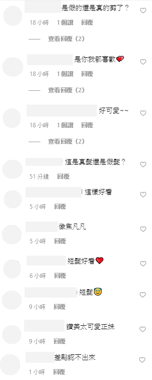 只見粉絲紛紛留言:「是假的還是真的剪了?」、「是你我都喜歡」、「差點認不出來」、「好可愛~」、「都很美啊~」、「美太可愛 短髮還真適合你!!!」、「讚美太可愛正妹」、「長髮短髮都好看」,受到滿滿的好評!