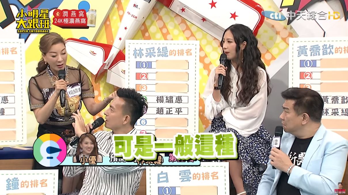 小鐘此話一出,白雲傻眼指著他,Sandy聽了咬牙切齒喊:「小鐘哥!」吳宗憲也尷尬「欸欸欸欸!」了好幾聲,就連平時最容易在節目中暴走的趙哥都忍不住說:「那壺不開提那壺啊!」不過林采緹仍然很有風度的笑說:「可是講得滿有道理的」。
